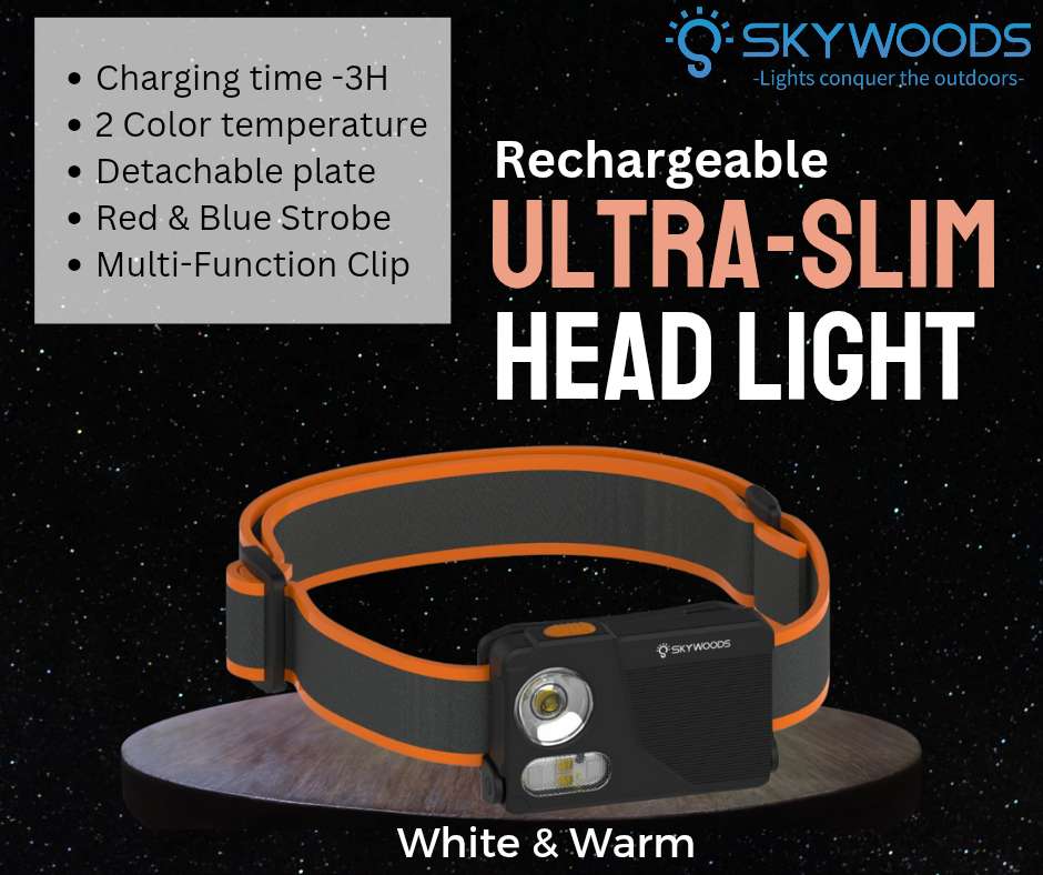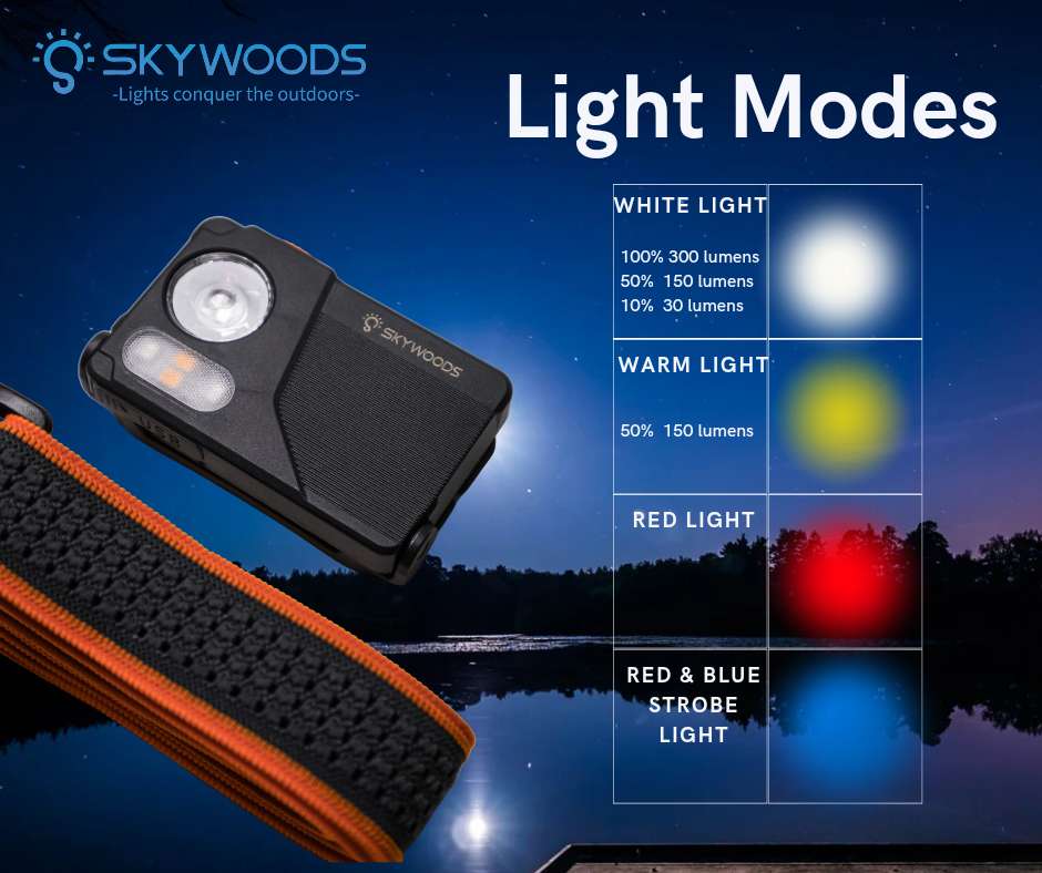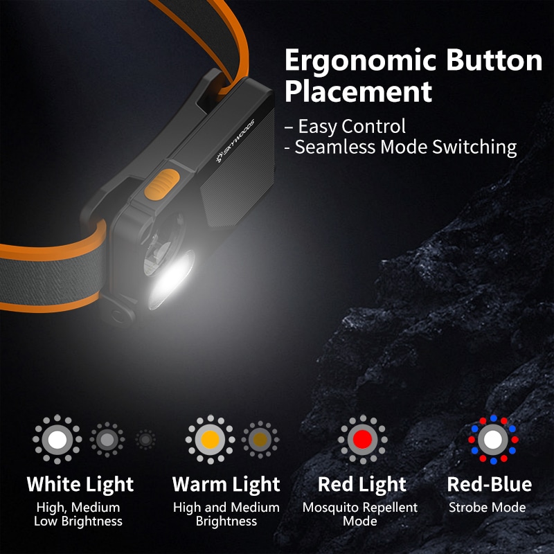 (1)Multiple Lighting Modes: Designed with multiple lighting modes—Low, Medium, and High. A long press of the button activates the warm light mode, which offers two levels: High and Low. Despite its compact body, this headlamp delivers a maximum brightness of up to 300 lumens.