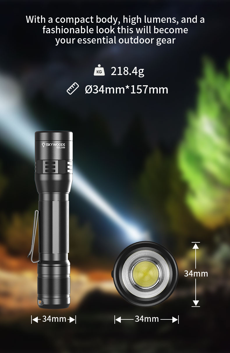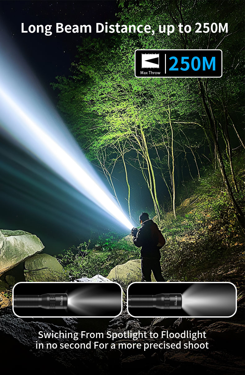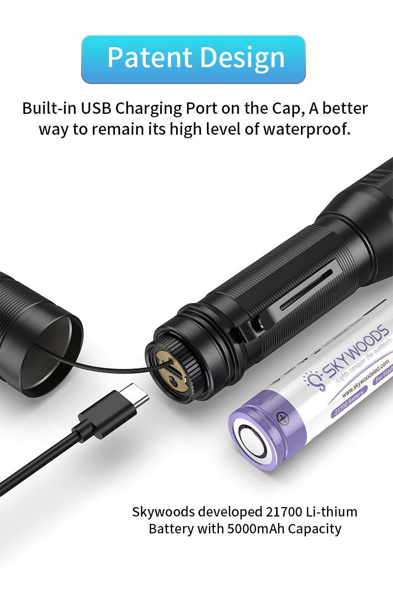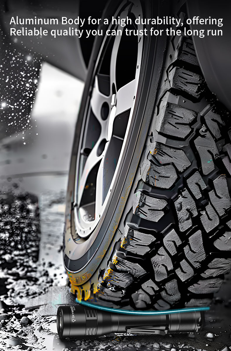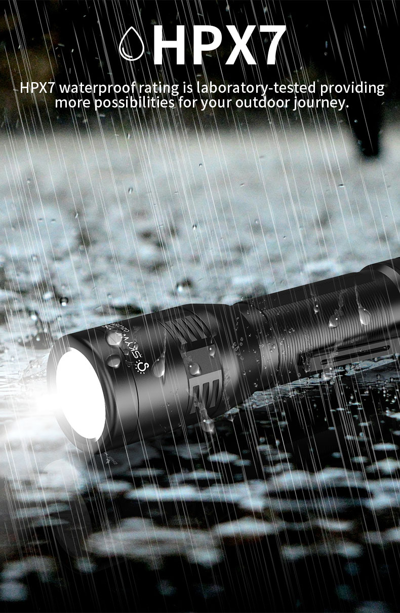 3)Material: Made of aircraft-grade aluminum alloy for durability and strength. With an IPX7 waterproof rating and high-quality materials, this outdoor flashlight is designed to prevent water from penetrating through any gaps