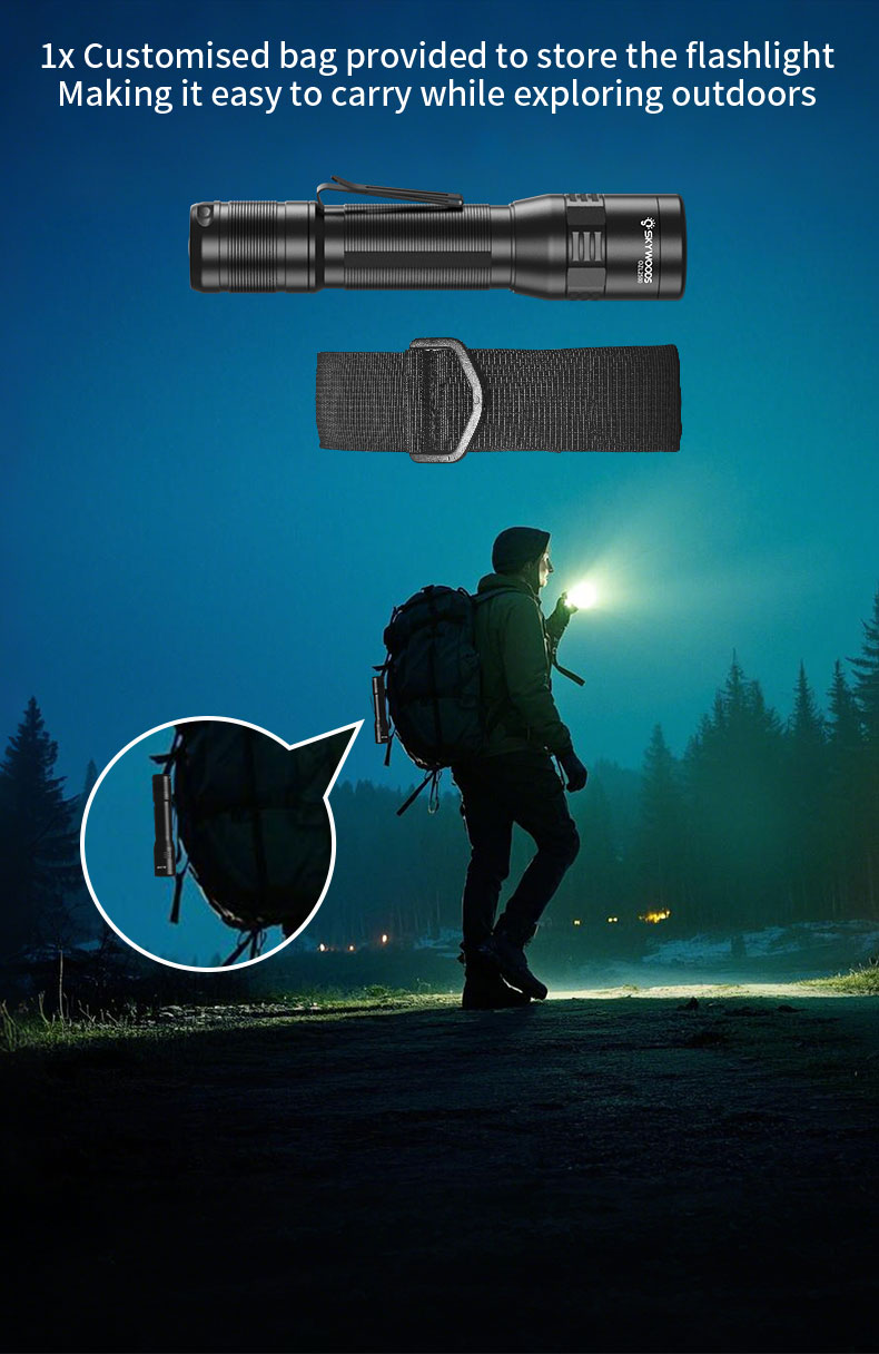5) A special pouch is included for storing the flashlight and making it easy to carry during outdoor activities. Each flashlight also comes with a clip that can be easily attached to a pocket or backpack, providing a convenient hands-free option.